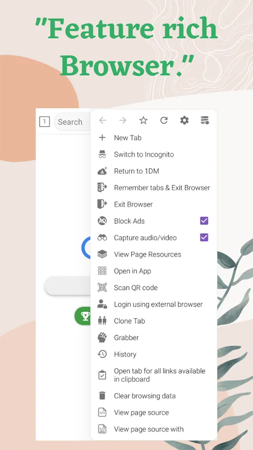 - المتصفح المدمج : متصفح التحميل مهكر 1DM+ Browser And Video يتميز بإمتلاكه متصفح مدمج يمكنك بواسطته التصفح في المواقع المختلفة والقيام بتحميل منها الملفات المرادة بصورة مباشرة.
