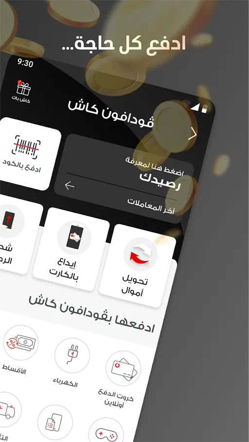 - فودافون كاش : الميزة الأبرز بعد تنزيل برنامج أنا ڤودافون للاندرويد بشكل مجاني هي توافر خدمات فودافون كاش التي تجعلك تستطيع القيام بعمليات الدفع المتنوعة بسهولة بالإضافة لتحويل الأموال وغيرها من الأمور الأخرى.