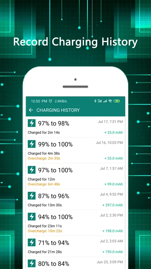 - سجل الشحن : من خلال هذه الأداة بعد تحميل تطبيق Super Charging Pro Master مهكر سوف تستطيع الوصول إلى تاريخ شحن البطارية وتحليل نمط الشحن مع سجل كامل على مدار الأيام, سيوفر ذلك مراقبة مباشرة لحالة البطارية الفعلية وأسباب إستهلاكها في أوقات مٌعينة بشكل غير طبيعي.