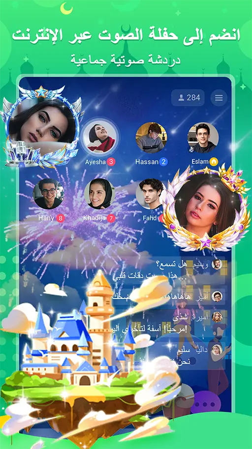 • تلاحظ الآن انضمامك للغرفة التي قمت بتحديده في الخطوة السابقة، وبمجرد دخول الغرفة تظهر لك رسالة ترحيب بانضمامك لهذه الغرفة، وتجد بالصفحة الظاهرة أمامك صورة الملف الشخصي الخاصة بكل مستخدم يشغل مقعدا بالإضافة لوجود مقعد فاضي ولكن مقفل ولا يمكن لأي شخص أن يشغل هذا المقعد دون قيام مالك الغرفة بإتاحة هذا المقعد، كما أنك تلاحظ بالأسفل وجود شريط إرسال الرسالة حيث إنك تقوم بالتواصل نصيا فقط لأنك لا تشغل أي مقعد، قم الآن بكتابة الرسالة التي تريدها ثم أرسلها إليهم.