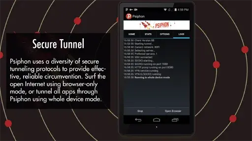- اتصال أمن : باستخدام برامج VPN سيتم منع تعقب بياناتك الخاصة من خلال مواقع الإنترنت والخدمات التي تستخدمها وسيتم استبدالها بالبيانات الخاصة بالموقع الافتراضي, وللحصول على اتصال آمن تماماً سيقوم تطبيق سايفون برو Psiphon Pro Mod مهكر بحظر أي موقع غير موثوق فيه قد يشكل خطر على هاتفك أو جهاز الكمبيوتر الخاص بك وسيرسل إليك إشعار بهذا, وهكذا يمكنك ضمان اتصال أمن من خلال البرنامج.