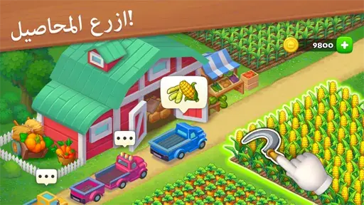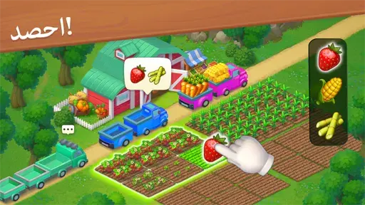 - كل محصول له وقت معين للنمو والجاهزية, في العموم ستجد القمح هو أسرع المحاصيل في النمو وهو المحصول المتاح لك في البداية, انتظر قليلا لينتهي المحصول من النمو والان لتقوم بحصد المحصول قم بالضغط على القطعة الزراعية وسوف تلاحظ ظهور أداة الجمع, قم بالتقاط هذه الاداة ومررها على المحاصيل لجمعها وستكون انتهيت من زرع وحصد المحاصيل باللعبة.