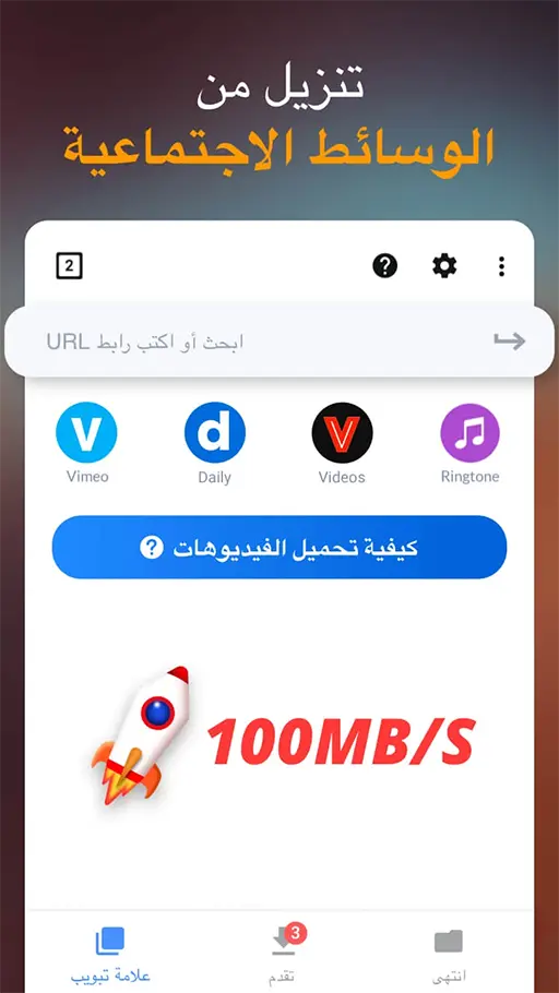 - هذه هي أهم الخانات الموجودة في القائمة وبعد علامة القائمة توجد علامة الترس وهي العلامة الخاصة بإعدادات أفضل برنامج تنزيل فيديوهات والتي تضم جميع الإعدادات الخاصة بهذا التطبيق و سنقوم بتوضيحها بالتفصيل في الفقرة التالية.