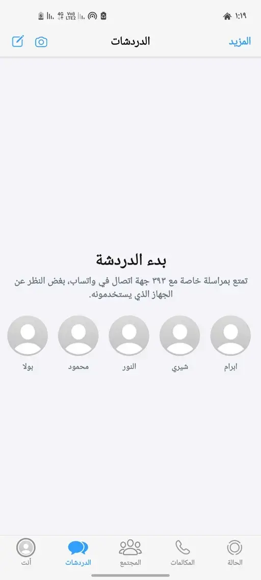 - عند بدء استخدام واتساب ايفون للاندرويد ضد الحظر تجد رسالة تعلمية في اسفل التطبيق عند ايقونة الدردشات توضح أن بإمكانك بدء محادثة من هذه الايقونة بعد الضغط عليها, اضغط على ( الدردشات ) لبدء استخدام التطبيق و الاستمتاع بالمميزات التطبيق.