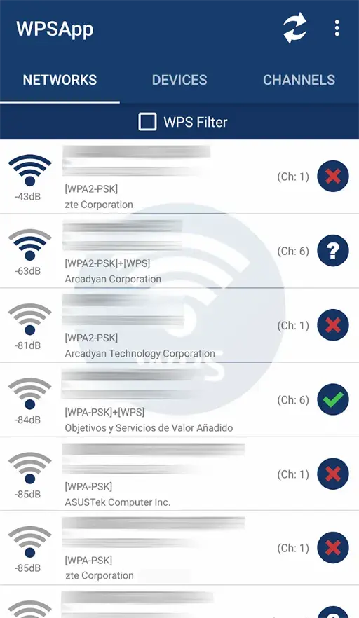 - اختراق الشبكات : يوفر لك تحميل تطبيق WpsApp Pro مهكر امكانية اختراق شبكات الـ WIFI ولكن لا تستطيع اختراق جميع الشبكات, حيث انه يعمل على اختراق الشبكات التي تستخدم صيغة ( Wps ), كما يقوم التطبيق ايضا بتحديد الشبكات التي تستطيع أن تتصل بها و الشبكات المحمية حيث تظهر بجانب الشبكات علامة دالة على مدى أمان الشبكة حيث تجد علامة ( X ) التي تعني أن الشبكة ذات حماية عالية وبالتالي يصعب اختراقها وتجد علامة استفهام وهذه العلامة تعني القدرة على اختراق هذه الشبكة.