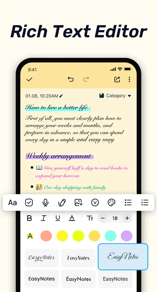 قم بـ تحميل تطبيق تدوين الملاحظات Easy Notepad واستمتع بخدمة التدوين التي يمكنك عن طريقها تسجيل جميع لحظاتك, الجدير بالذكر أن تلك الخدمة لا ترتبط بعدد الكلمات بل يمكنك كتابة المدونة بكلمات بلا حدود, بالإضافة إلى أن عملية التدوين يمكنك تنسيقها بالصورة المرادة وذلك بواسطة أدوات التنسيق المتوفرة في تطبيق Easy Simple Note مثل : البولد التي تعمل على تكبير خط النص وتظليله, أيضا تجد ميزة الخط المائل الذي بواسطته يمكنك كتابة النص بميول بسيط أيضا ميزة التحديد التي تقوم بواسطتها بكتابة النص مع وضع خط أسفل هذا النص, أيضا تتوفر ميزة تنسيق الأسطر التي بواسطتها يمكن ترقيم الأسطر التي يتم تحديدها, الجدير أيضا بالذكر أنك تستطيع التحكم في حجم الخط ولونه بجانب تحديد نوع هذا الخط.