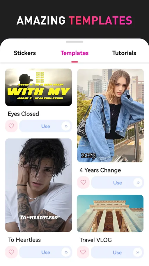 يوفر برنامج EasyCut مهكر عدد لا نهائي من القوالب يمكنك الدخول إليها وتمرير الصفحة لأعلى كما لو كُنت تتصفح فيديوهات على أي منصة, إن نال أحد القوالب إعجابك هٌناك زر للدخول ووضع صورك فيه وخلال لحظات سوف يتم إنتاج الفيديو الجديد الخاص بك, يقوم القالب بعرض معلومات مهمة مثل الصور التي عليك تحديدها إن أردت إستخدامه ويمكنك خلال التصفح وضع القوالب الجيدة في صفحة مخصصة تسمى ( المفضلة ) وعند وضعهم سيكون من السهل الوصول إليهم في لحظات بسيطة, النسخة المهكرة توفر لك جميع القوالب بشكل مجاني حيث في النسخة المجانية هٌناك بعض القيود على قوالب إحترافية.