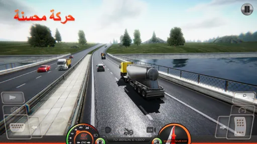 - عجلة التوجيه : لعبة Euro Truck Simulator 2 الأصلية للاندرويد تمتلك عجلة توجيه تستخدمها للتحكم في توجيه الشاحنة, تتوفر أيضا وسائل أخرى للتحكم وبالتالي يمكن تحديد الوسيلة المناسبة لك لإستخدامها في التوجيه.