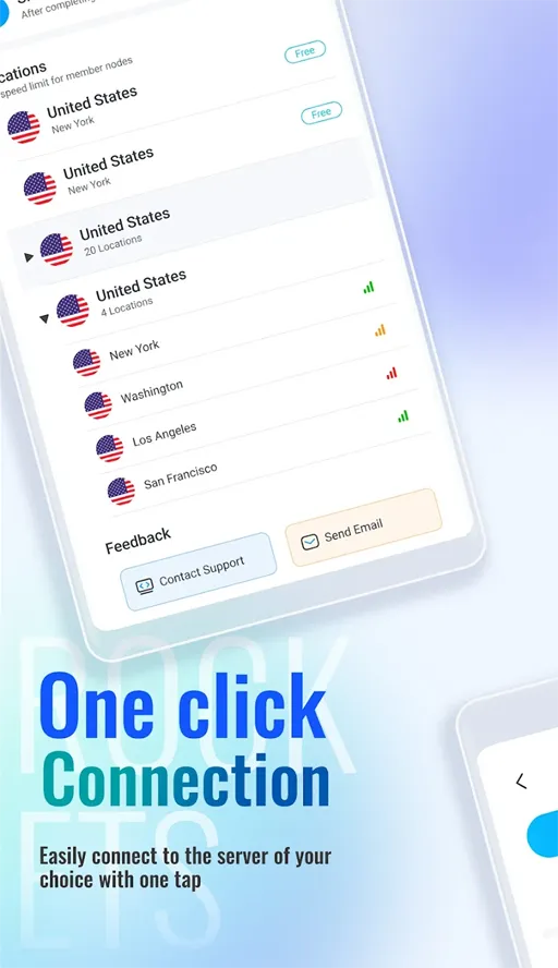 بالإضافة لهذه الميزة يمكنك الإستمتاع أيضا بتجربة الإتصال السريع التي تجعل المستخدم يتمكن من الإتصال بالخادم الأسرع دون الحاجة للبحث عنها كثيرا حيث أن تلك الخدمة تجعل تطبيق F1 Rockets VPN مع عرض نتائج الخوادم يقوم بتحديد الخادم الأفضل والأسرع من هذه الخوادم التي يمتلكها في ثواني معدودة ثم يقوم بالإتصال به تلقائيا دون الحاجة للقيام بأي خطوات أخرى.