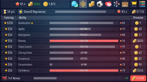 • التدريبات والترقية : أيضاً من الجوانب المهمة والأساسية في لعبة Football Superstar 2 Game مهكرة أنها توفر تدريبات متنوعة لتحسين مهارات اللاعب وذلك الأمر متوقع لأن النجاح في الحياة العملية يتأثر بشكل أساسي بالتدريبات, والتدريبات ستوفر نظام ترقية للجوانب البدنية والتكتيكية.