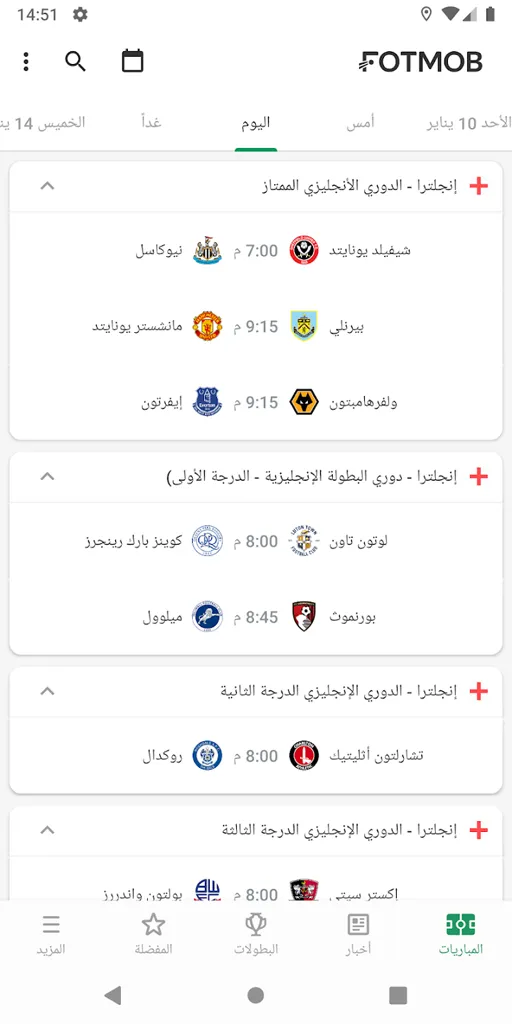 الجدير بالذكر أن تطبيق متابعة كرة القدم FotMob Pro مهكر النسخة المدفوعة لا يعمل على تقديم لك جدول المباريات الخاص بيوم بعينه بل تستطيع الإطلاع على الجدول الخاص بأي يوم تريده, حيث يتوفر في برنامج فوت موب مهكر اخر اصدار خيار التقويم الذي بواسطته تقوم بتحديد اليوم المراد حتى وإن كان هذا اليوم في الماضي لكي يتم عرض لك المباريات الخاصة بهذا اليوم.