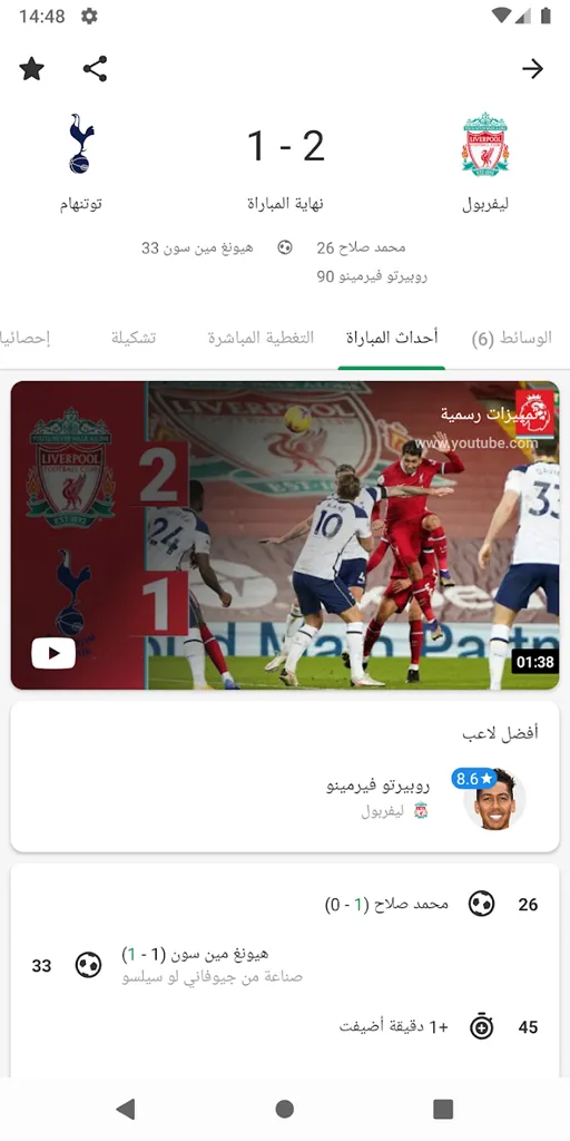 بالتالي إذا كانت تلك المباريات إنتهت بالفعل يتم عرض النتيجة الخاصة بالمباراة بعد “تحميل تطبيق Fot Mob فوت موب مهكر” كما يمكنك الإطلاع على المزيد من التفاصيل حول تلك المباراة بكل سهولة من خلال النقر على الخيار الخاص بهذه المباراة, حيث تظهر أمامك صفحة تحتوي على جميع أحداث تلك المباراة بالإضافة لعرض الإحصائيات الخاصة بالمباراة مثل : نسبة الإستحواذ على الكرة و عدد التسديدات على المرمى لكل فريق وعدد الضربات الركنية بالإضافة أيضا للعدد التسللات والعديد من الإحصائيات الأخرى التي يمكن أن تحتاج لمعرفتها عن تلك المباراة.