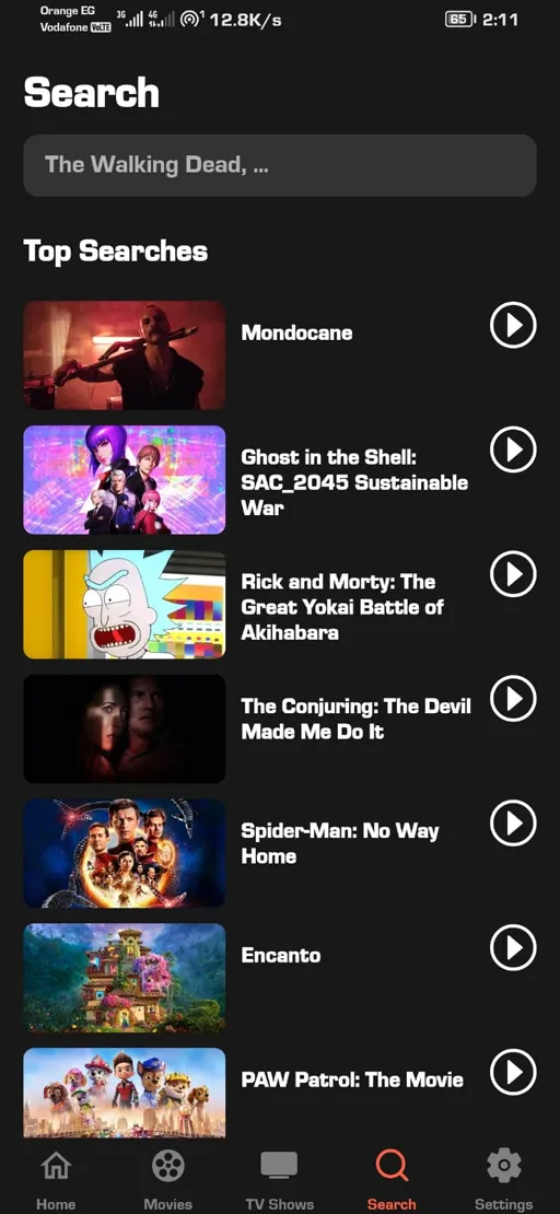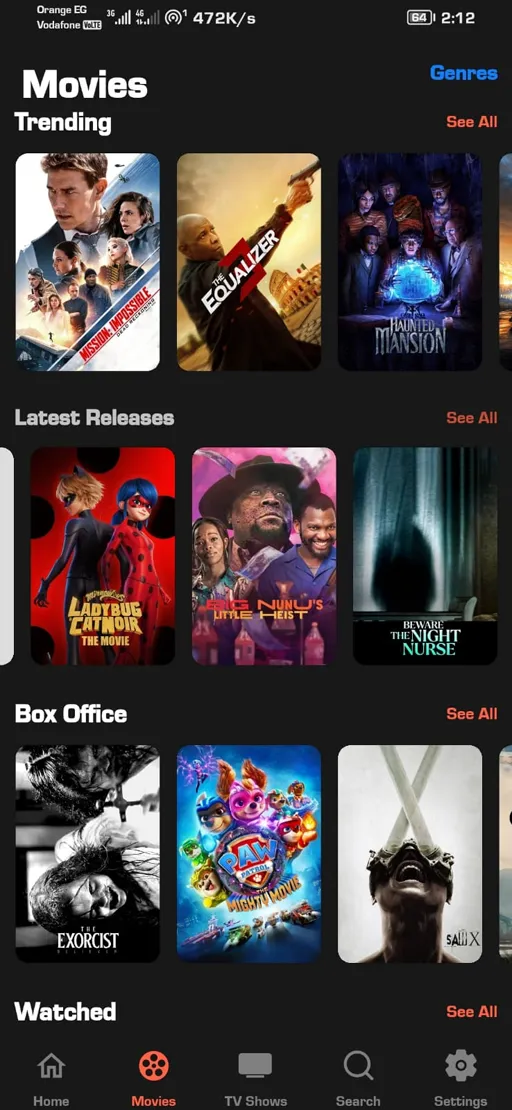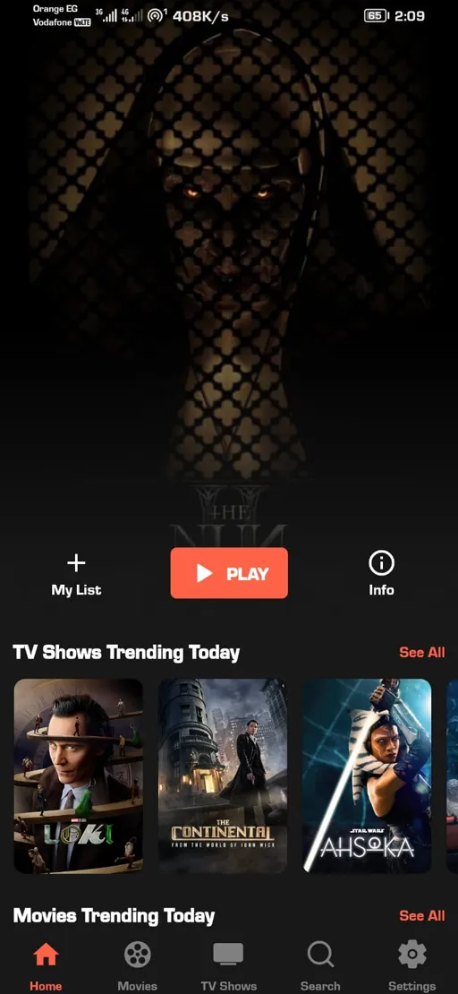 يوجد بواجهة تطبيق HDO Box للاندرويد شريط تبويب في الأسفل وهذا الشريط يحتوي على 5 خيارات مبوبة وهم الرئيسية الذي يظهر به أفضل المحتويات والخيار الثاني خاص بالافلام والثالث خاص بالبرامج التلفزيونية كما تجد خيار خاص بالبحث واخر للاعدادات, الان سنوضح كيفية تشغيل الفيلم من خيار الرئيسية.