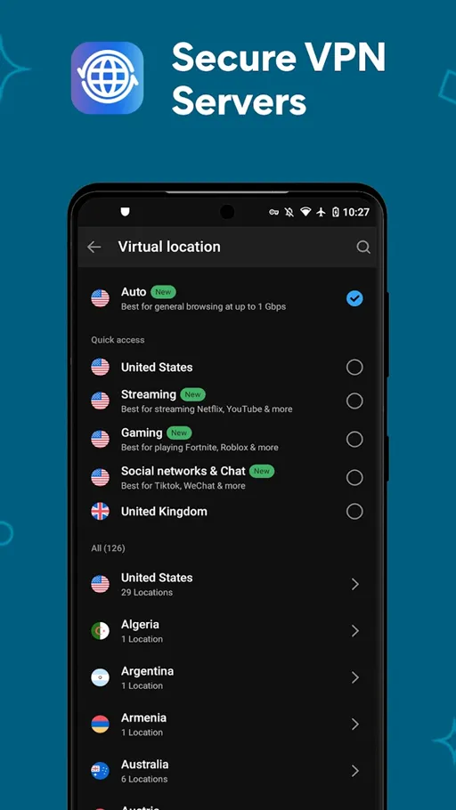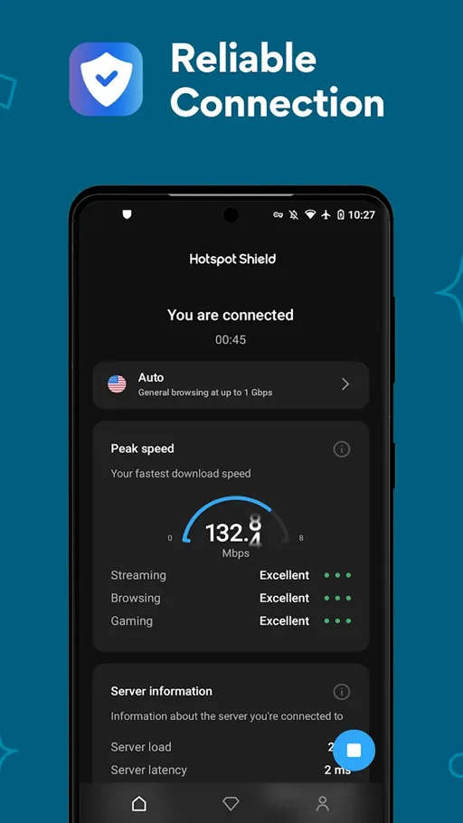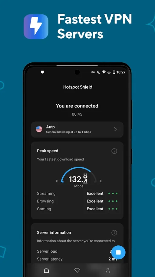 من الأمور التي يحرص عليها كل مستخدم أثناء الإتصال بأحد الخوادم هو البحث عن الخادم الأسرع من بين الخوادم المتاحة بعد تحميل التطبيق, هذه العملية الخاصة بالبحث قد تستغرق منك الكثير من الوقت والجهد في معرفة الخادم الأفضل, المطور حرص على تقديم لك ميزة الإتصال التلقائي التي بواسطتها يمكنك الاستمتاع بالاتصال بأفضل خادم متوفر بعد تحميل Hotspot Shield مهكر للاندرويد في مدة زمنية قليلة وبدون أن تحتاج للبحث عن هذا الخادم من بين الخوادم الأخرى, هذه الخدمة يمكنك الاستمتاع بها عن طريق تحديد الخيار الخاص بالإتصال التلقائي الذي يوجد في صفحة السيرفرات الموجودة في برنامج هوت سبوت شيلد Hotspot Shield Premium مهكر ثم القيام بنقر زر بدء الإتصال.