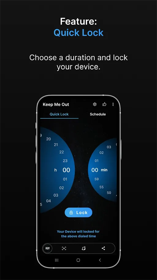 - القفل السريع : هذه الوسيلة في برنامج Keep Me Out Phone lock مهكر لـ الهواتف يمكنك استخدامها في الوقت المراد بصورة مفاجئة دون أي ترتيب مسبق وبالتالي إذا تريد منع استخدامك للهاتف في الحال يمكنك الاستمتاع بهذه الخدمة حيث أنك تقوم فيها بتحديد عدد الساعات وعدد الدقائق المراد تفعيل القفل بها والنقر على زر القفل, بمجرد نقر هذا الزر تلاحظ ظهور قائمة خاصة بتأكيد القفل التي يمكنك من خلالها الإطلاع على جميع التفاصيل الخاصة بقفل هاتفك مثل مدة القفل ووقت إلغاء القفل وبعض المعلومات الأخرى, في هذه القائمة يتوفر زر تأكيد يمكنك من خلاله تأكيد عملية القفل حيث بمجرد النقر فوقه تلاحظ قفل الهاتف بصورة لحظية.