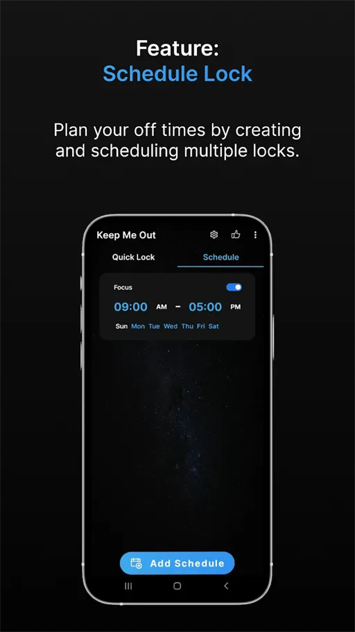 - برمجة القفل : بالإضافة لخدمة القفل السريع يمكنك الإستمتاع أيضا بخدمة جدولة القفل حيث يمكنك عمل جدول تقوم بتحديد به اليوم والوقت الخاص ببدء القف ووقت انتهاء القفل لكي يعمل برنامج عدم التشتت Keep Me Out مهكر اخر اصدار على تفعيل خدمة القفل في هذا الوقت تلقائيا.