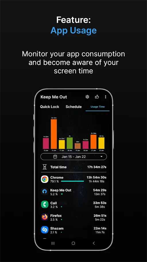 علاوة على خدمة القفل التي يوفرها تطبيق Keep Me Out Mod مهكر لنظام الأندرويد تتوفر أيضا خدمة خاصة بوقت الاستخدام التي يمكنك بواسطتها الإطلاع على وقت استخدامك للتطبيقات التي توجد على الهاتف, بالتالي إذا كنت تريد إدارة وقتك على الهاتف بصورة صحيحة يجب عليك معرفة التطبيقات التي تستخدمها وتحديد البرنامج الأكثر استخداماً وذلك من خلال تلك الخدمة حيث أنك تستطيع معرفة الوقت الخاص باستخدام كل تطبيق.