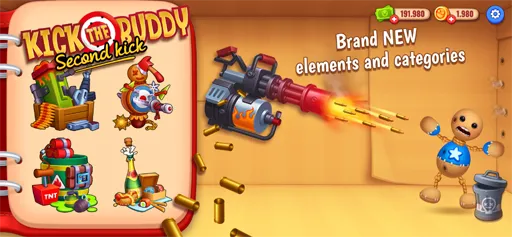 - الأسلحة والأدوات : تقدم لعبة Kick The Buddy 2 مهكرة تشكيلة أوسع وأكثر تنوعا من الأدوات الأسلحة التي متاج لك استخدامها في تعاملك مع بودي بالإضافة للعمل على توفير أدوات إبداعية تفاعلية.