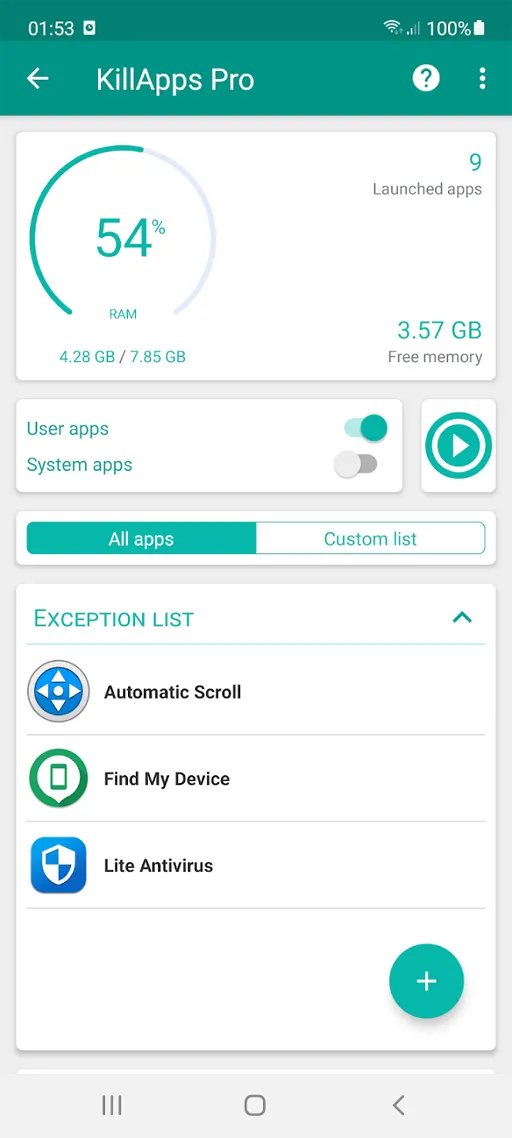 تتوفر في تطبيق Kill Apps Pro مهكر للاندرويد أيضا قائمة خاصة بالاستثناءات المستخدم يمكنه نقرة واحدة إيقاف التطبيقات من خلال تلك القائمة الخاصة بالاستثناءات يمكنك تحديد التطبيقات المراد أن تعمل في الخلفية أثناء تفعيل هذه الخدمة, حيث يقوم برنامج KillApps مهكر بإيقاف التطبيقات عدا تلك القائمة الخاصة بالاستثناءات, أيضا تتوفر قائمة خاصة بالتطبيقات التي تم تشغيلها وبالتالي هذه القائمة تظهر بها أي تطبيق تم تشغيله, أيضا تتوفر قائمة أخرى خاصة بفشل الإغلاق والتي تلاحظ بها كل تطبيق فشل إغلاقه, الجدير أيضا بالذكر أن تطبيق KillApps Apk Mod مهكر للاندرويد يحتوي به على خيار خاص بغلق التطبيقات الخاصة بالمستخدم وأخرى للنظام وبالتالي تستطيع اختيار التطبيقات المراد إغلاقها.