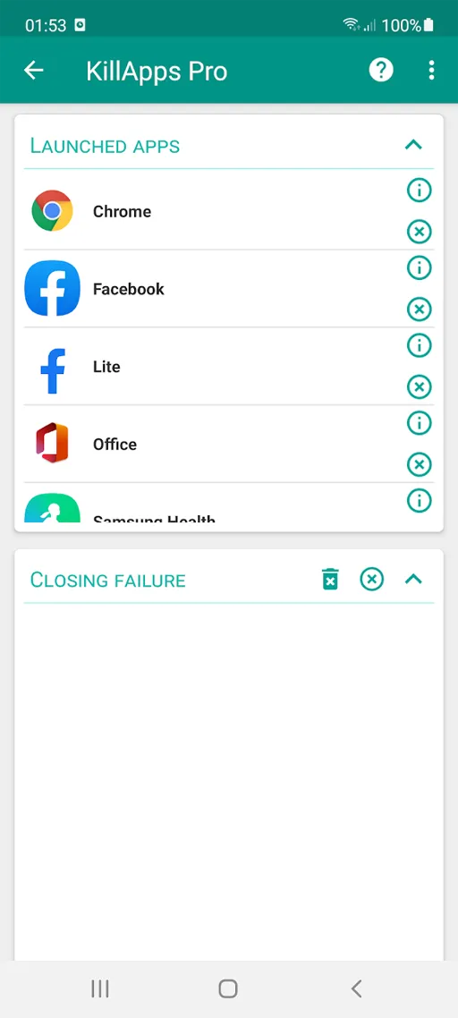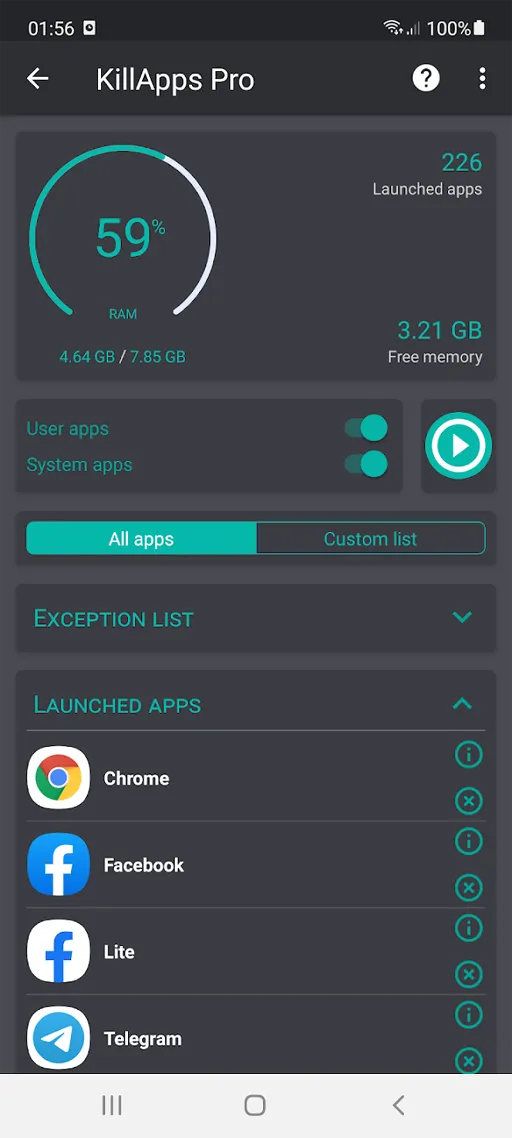 - إغلاق التطبيقات : من أبرز مميزات تحميل تطبيق KillApps Pro مهكر امتلاكه ميزة اغلاق التطبيقات بالتالي تتمكن بواسطتها من إغلاق التطبيقات النشطة بخلفية الهاتف والتي تعمل على استهلاك موارد جهازك.