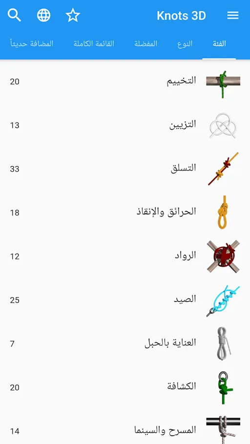 ثاني الأقسام بالنسبة للواجهة الرئيسية بعد تحميل تطبيق Knots 3D مهكر للاندرويد هو قسم النوع ويٌصنِف الفئات حسب نوعها من حيث الربط والفك أو التدوير, وهذا القسم سوف يفهمه بشكل أكبر الأشخاص الذين يدرسون علوم التسلق والتخييم لأن العقد لها تصنيفات علمية مختلفة في البرنامج, القسم الثالث خاص بالقائمة المفضلة وسوف نتحدث عنه بشكل تفصيلي لاحقاً والقسم الرابع يعرض جميع المجموعات الخاصة بالعقد بدون أي تصنيفاً وأخر الأقسام في الواجهة الرئيسية بعد تحميل تطبيق Knots 3D مهكر اخر اصدار هو قسم جميع أنواع العقد المضافة حديثاً.