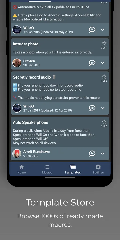 علاوة على الخدمات المميزة التي يحتوي عليها التطبيق يمكنك الاستمتاع أيضا بمجموعة كبيرة من النماذج الجاهزة التي يوفرها, بالتالي لا تضطر للقيام بخطوات إنشاء الماكرو داخل برنامج ماكرو درويد MacroDroid مهكر بل يمكنك الانتقال لتلك القائمة الخاصة بالنماذج الجاهزة والقيام بالبحث عن النموذج الذي يوفر الإجراءات والإيماءات المرادة لكي تقوم بتفعيلها بنقرة واحدة.