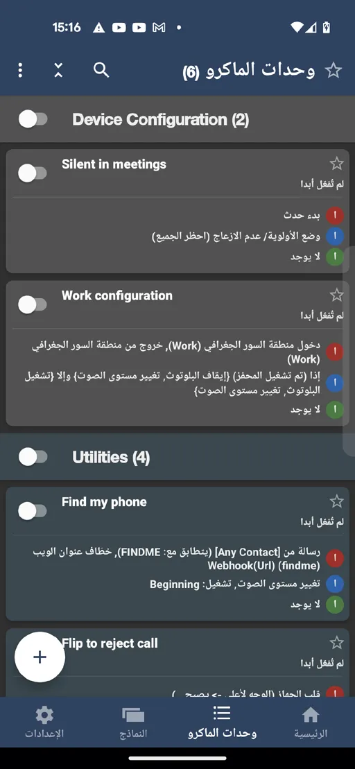 ومن الأشياء الرائعة بعد تنزيل MacroDroid مهكر اخر اصدار أيضا أنه يوفر قائمة خاصة بإدارة وحدات الماكرو لأن الواجهة الرئيسية تحتوي بها من الأسفل على الخيار المبوب ( وحدات الماكرو ) الذي تنقر فوقه لكي تنتقل لقائمة الماكروهات حيث تظهر بها خيارات متعددة خاصة بالماكروهات التي تم إنشاؤها.