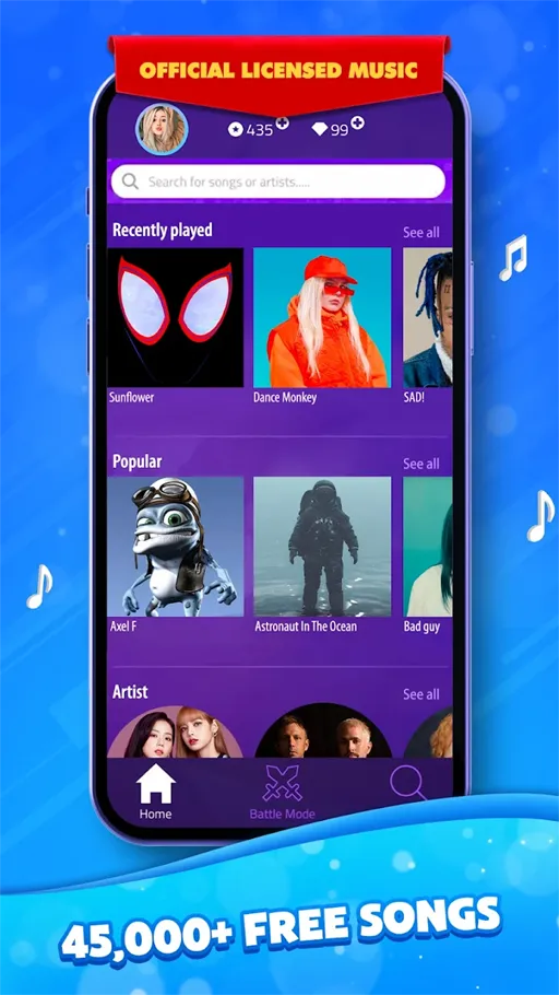 - مُحرك البحث : تمتلك لعبة Magic Tiles مهكرة كاملة للاندرويد أيضا محرك بحث عالي الدقة يمكنك من خلاله البحث عن الأغاني التي تريدها من قائمة الموسيقى المتوفرة باللعبة.