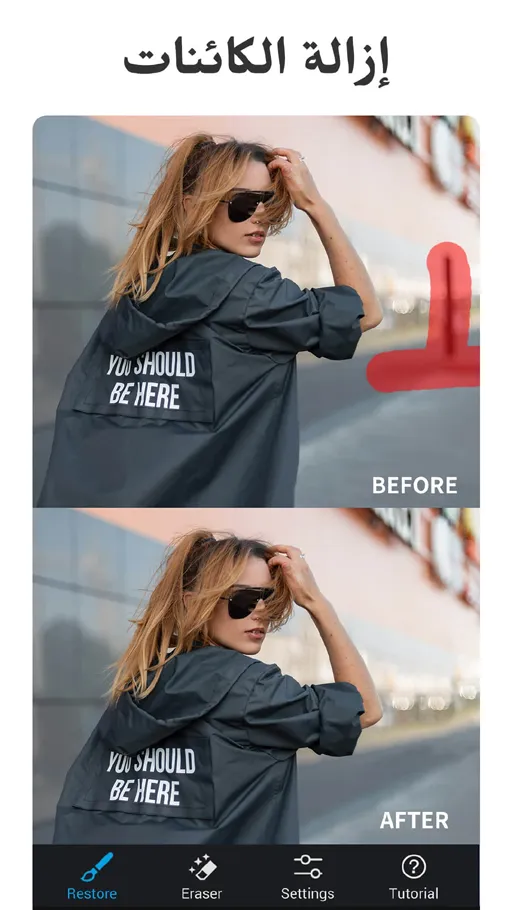 - إزالة : في هذا الخيار أيضاً يتمكن المستخدم من إزالة العيوب من الصورة التي تم التقاطها, كما يوجد أداة لإزالة النصوص وهذه الأداة تتعرف على النصوص الموجودة في الصورة ويتم حذفها بشكل إحترافي, وعملية الإزالة تعتمد على الذكاء الإصطناعي وتتم بتحديد الشئ المٌراد إزالته فقط.