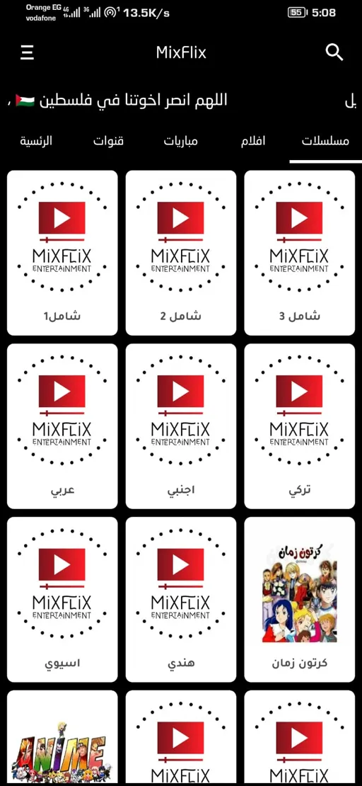 - فلسطين : من القنوات العربية المُتاحة في تطبيق Mix Flix Apk مهكر للاندرويد برابط مباشر من ميديا فاير لمشاهدة القنوات الفلسطينية وبالتالي يمكنك مشاهدة هذه القنوات, وتلك القنوات التي يمتلكها برنامج ميكس فليكس مهكر مجانا لمشاهدة الافلام مثل : القدس والأقصى وقناة بلدنا الفضائية وقنوات أخرى متنوعة.