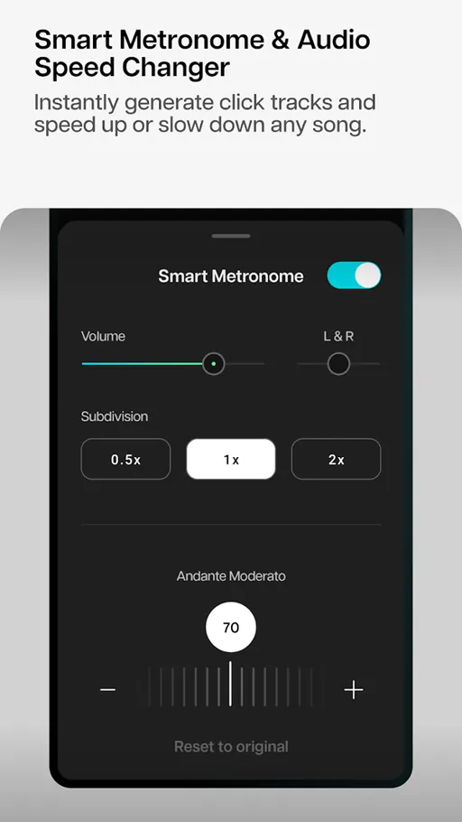 من الأدوات المميزة أيضا في برنامج مويسيس Moises Apk Mod مهكر هى أداة الرجوع للأصل التي بمجرد النقر فوقها تلاحظ تشغيل الموسيقى بالتعديلات الأصلية وإزالة جميع الإعدادات الخاصة بالأغنية التي قمت بضبطها, علاوة على ذلك المطور حرص على توفير لك إمكانية القيام بتحديد السرعة المراد تشغيل الأغنية بها, بالتالي يمكنك الاستماع للأغنية المفضلة بالسرعة التي تحددها في إعدادات “تطبيق Moises Premium Apk مهكر للاندرويد”, أيضا توجد ميزة بدء العد التي يمكنك تفعيلها لكي يقوم ببدء عد تنازلي لعدد الثواني التي تقوم بتحديدها لكي يتم تشغيل الأغنية المحددة بعد انتهاء هذا العد التنازلي.