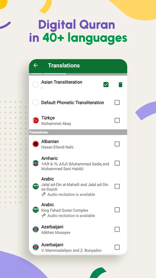 ولغة الترجمة تقوم أنت بتحديدها من بين العديد من اللغات المتنوعة, يُمكن أيضا في تلك الخدمة تحديد الأية التي قمت بالوصول لها في القراءة لكي تستطيع إستكمال القراءة مرة أخرى بداية من الأية التي تم الوصول لها دون الحاجة لبدء القراءة من جديدة وبالتالي تساعدك هذه الميزة على ختام قراءة القران.
