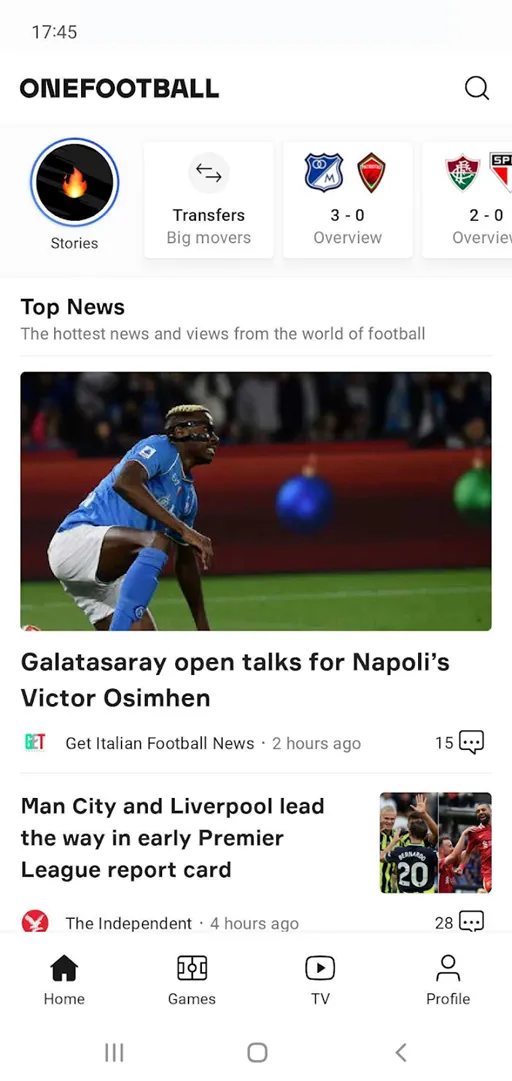 • أخبار الرياضة : يحتوي تطبيق وان فوتبول OneFootball مهكر على قائمة خاصة بأخبار الرياضة التي تستطيع بواسطتها متابعة أخبار جميع اللاعبين والأندية المفضلة لك بشكل حصري, هذه الأخبار يتم تحديثها بصورة دورية كما أنها تتميز بالمصداقية العالية.