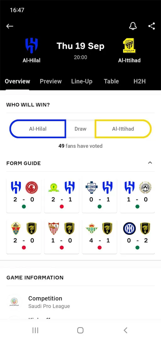 كما يُظهر برنامج وان فوتبول اخر اصدار OneFootball Mod Apk التشكيل الذي سيلعب به كل فريق في المباراة بمجرد أن يتم الإعلان عنه وتتوفر قائمة أخبار خاصة بتفاصيل المباراة أي تحتوي على أخبار خاصة بهذه المباراة, يمكن الإطلاع أيضا على ترتيب الفريقين في البطولة التابع لها المباراة مما تستطيع معرفة عدد المباريات التي خاضها أي فريق وعدد مرات الفوز والتعادل والهزيمة التي تعرض لها.