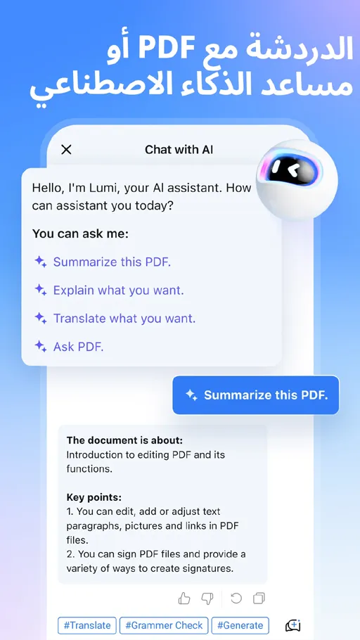 تطبيق قراءة ملفات PDFelement PDF مهكر يتميز بأنه يوفر مجموعة من الأدوات التابعة لتقنية الـ AI والتي تيسر من الإستمتاع بالخدمات المتنوعة ولكن عليك العلم أن هذه الأدوات لا تعمل سوى في وضع الأونلاين ايي يجب أن تكون متصل بالإنترنت لكي تستمتع بخدماتها, الأدوات التابعة لهذه التقنية تتمثل في :
