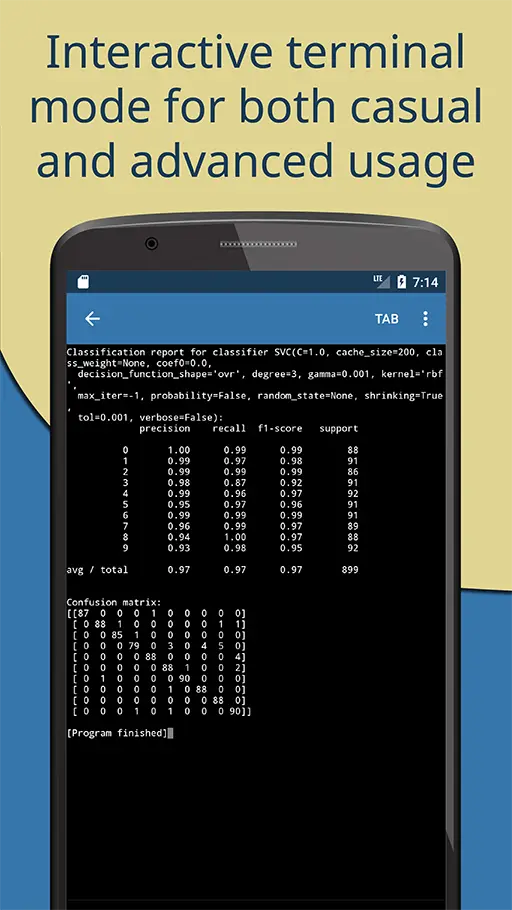كما أن تطبيق البرمجة Pydroid 3 مهكر يوفر محطة طرفية كاملة تدعم تنفيذ جميع أوامر بايثون وإدارة الحزم والملفات, ذلك الأمر يساعد المبرمجين على التحكم الكامل ببيئة التطوير بكل سهولة, مع العلم أنه يوفر دعم كامل لأوامر pip وإمكانية تثبيت أي مكتبة من PyPI, وذلك التكامل يجعل منه الأكثر شمولاً كمنصة تلبي احتياجات أي شخص يبحث عن أدوات احترافية للبرمجة.