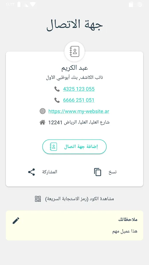 • جهة الإتصال : تتوفر أيضا إمكانية عمل ملف يشمل معلومات عديدة حول أي شخص مراد, تلك المعلومات التي يمكنك مشاركتها مثل : الاسم الخاص به بالإضافة للعنوان وأيضا يمكنك إدخال اسم الشركة التي يعمل بها بجانب تعيين رقم الهاتف الذي يمتلكه وأيضا البريد الإلكتروني لتسهيل عملية التواصل معه, أيضا تتوفر إمكانية تحديد العنوان الخاص به بجانب موقع الويب.