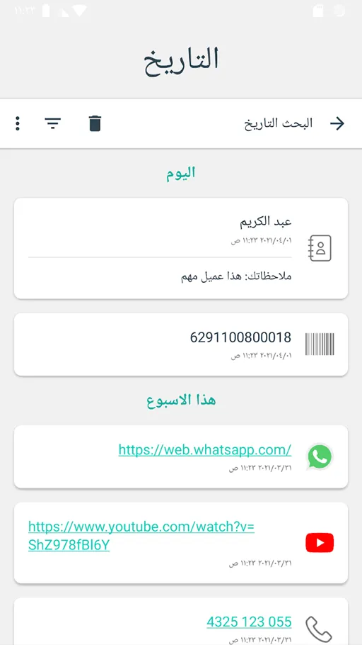 • السجل : يتميز تطبيق قارئ الباركود Code Reader مهكر بإمتلاكه خدمة السجل الذي يتم حفظ فيه الموز التي قمت بمسحها داخل تطبيق BarCode Scanner, وبالتالي تتمكن من الاستمتاع بأي رمز قمت بمسحه من قبل بدون قيود.