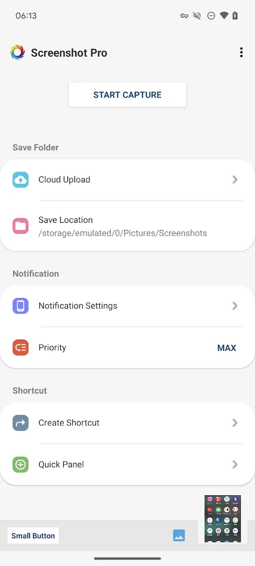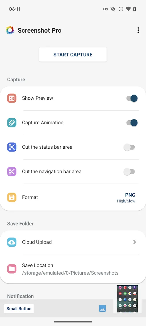 - خيارات التحكم : يوفر تطبيق ScreenShot Pro مفتوح خيارات كثيرة لتخصيص التجربة الخاصة به, فـ مثلاً تجد زر للتبديل بين الصيغ المتاحة أي تغيير صيغة حفظ الصور المٌلتقطة, ونجد زر آخر للتحكم في مسار التحميل والحفظ على ملفات الهاتف.