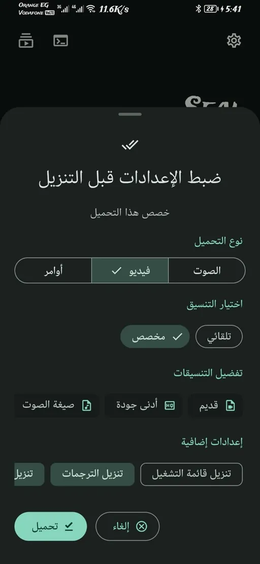 قبل الدخول في تفاصيل صفحة أو نافذة الإعدادات التي تظهر قبل التحميل فـ دعنا نخبرك أن تطبيق Seal لتحميل الفيديوهات عبر اليوتيوب لا يفرضها على المستخدمين ويٌمكن من قسم الإعدادات ضبط الخيارات لمرة واحدة ومن ثم بدء التحميل مباشرة بعد لصق رابط الفيديو ولكن هذه الصفحة مهمة بالنسبة للبعض نظراً لأنها توفر خيارات رائعة لتخصيص عملية التحميل عبر تطبيق Seal Downloader App, تنقسم الصفحة إلى ثلاثة خيارات وهم ( الفيديو , الصوت , الأوامر ) وصفحة الأوامر هي الخاصة بتحميل عدد كبير من الفيديوهات أو قائمة تشغيل كاملة داخل تطبيق سيل Seal مهكر اخر اصدار.