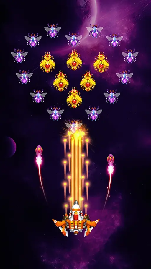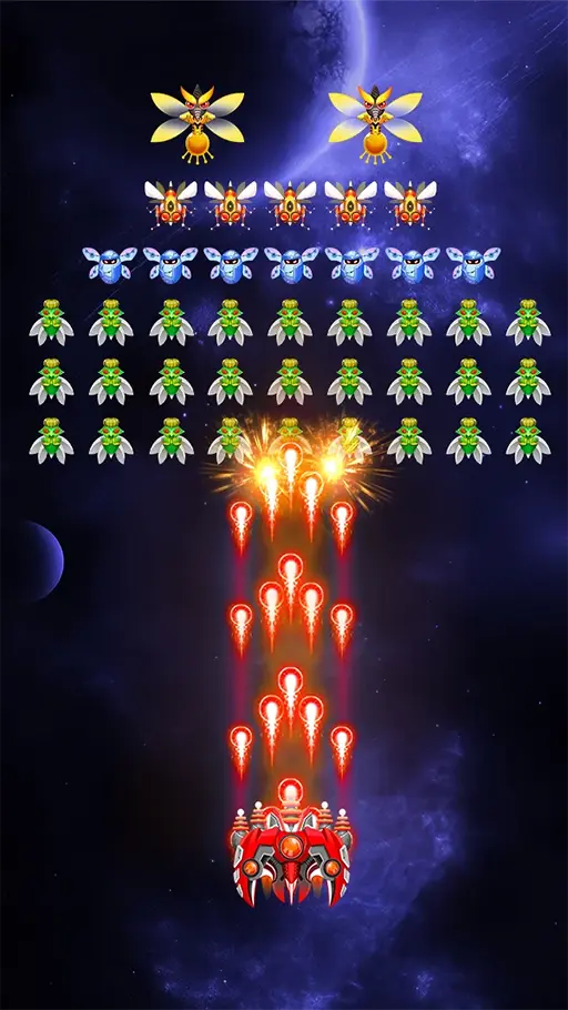 - المدفع الكلاسيكي : يُعدّ المدفع الرئيسي من أبرز ما تجده بعد تحميل لعبة Space Shooter مهكرة للاندرويد، وهو السلاح الكلاسيكي الذي تبدأ به رحلتك القتالية في الفضاء منذ اللحظة الأولى. يعمل هذا المدفع على إطلاق النار بشكل متواصل وتلقائي نحو الأعداء، وما يجعله مميزاً رغم بساطته أن يمكنك ترقيته تدريجياً لرفع معدل إطلاقه وزيادة تأثيره على الكائنات الفضائية المختلفة.