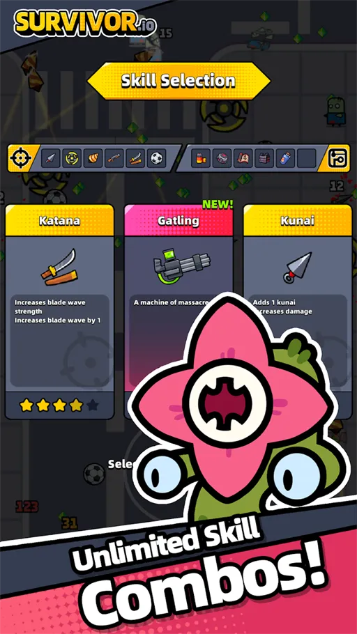 كما تعمل لعبة زومبي المدينة Survivor.io لنظام الأندرويد أيضا على إظهار الكثير من المهارات التي يمكن تحديد منها المهارة المناسبة لك لكي يتم استخدامها في قتل عدد أكبر من الأعداء بسهولة أكبر, الجدير بالذكر أن هذه الميزة الخاصة بالحصول على أدوات المساعدة تظهر كل مدة محددة وبالتالي يمكنك استخدام عدد كبير من الأدوات أثناء اللعب مما تعمل على زيادة قوتك بشكل كبير بصورة تدريجية.