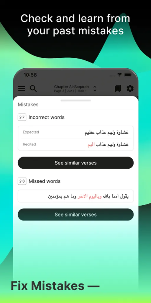 بعد تحميل تطبيق ترتيل Tarteel مهكر سوف يتوفر لك وضع الأخطاء الذي من خلاله يتم العمل على تظليل الأخطاء المتكررة بجانب تظليل الأخطاء المخفية, ومعرفة الأخطاء الخاصة بالتلاوة يختلف عن خطأ الحفظ, حيث يتم التعرف على خطأ التلاوة بواسطة الذكاء الاصطناعي وبمجرد اكتشاف أي خطأ يعمل “تطبيق ترتيل Tarteel” على التصرف بصورة محددة لتنبيهك لوجود خطأ مثل : تشغيل الصوت أو هز الجهاز.