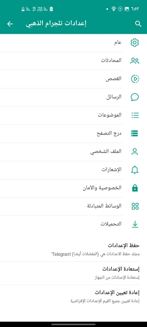 نظرة على الإعدادات بعد تحميل تليجرام الذهبي ابو عرب Telegram Gold Mod مهكر
