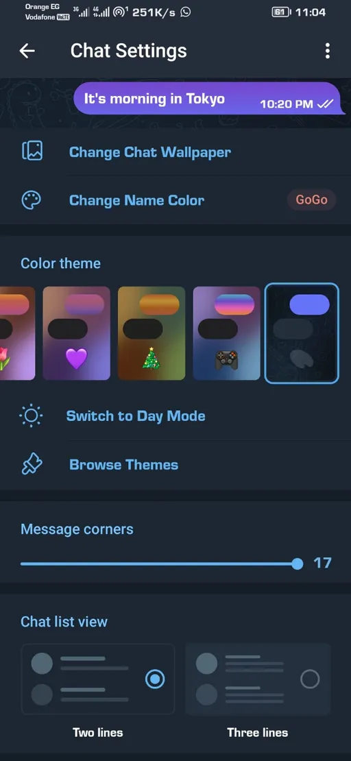بالإضافة لذلك المستخدم يمكنه التحكم في بعض الإعدادات الخاصة بالدردشة والتي بها تتوفر إمكانية تحديد الدرجة الخاصة بزوايا الرسائل بجانب وجود خيارات حول تحديد طريقة عرض قائمة المحادثات.