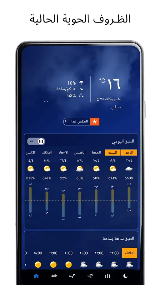 بعد تحميل تطبيق Transparent Weather مهكر يمكنك الإستمتاع بالتنبؤ اليومي أي تتابع حالة الجو على مدار الأسبوع يعرض أيضا تنبؤ ساعة بساعة مما تستطيع الإطلاع على درجات الحرارة في كل ساعة على مدار اليوم الواحد, هذه الميزة تساعدك في اتخاذ القرارات حول الوقت المناسب للقيام بعمل محدد يمكن أن تتأثر بحالة الطقس.