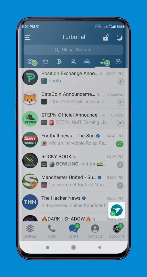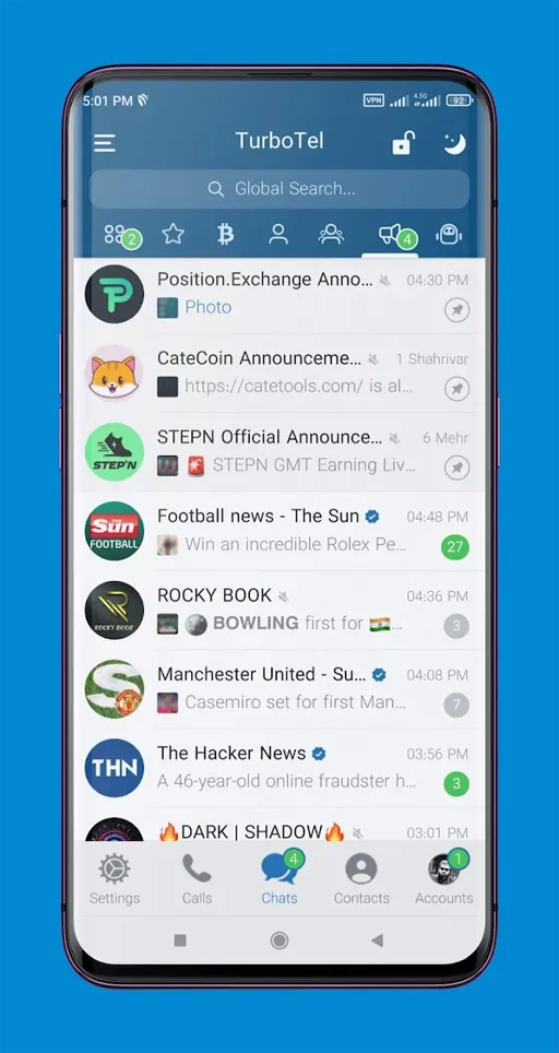 يدعم تطبيق TurboTel Pro Mod Apk ميزة تعدد الحسابات أي تستطيع تسجيل الدخول بأكثر من حساب في التطبيق أي أنك إذا كنت تملك أكثر من حساب يمكنك تسجيل الدخول بهم والإستمتاع بإدارتهم معا بسهولة حيث أنك تستطيع التبديل بين هذه الحسابات بنقرة واحدة وبدون القيام بتسجيل الخروج من أي حساب.