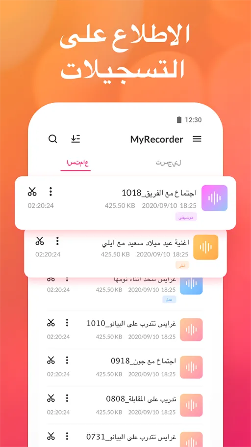 الحفظ والتصنيف للتسجيلات في تطبيق مسجل الصوت Voice Recorder Mod Apk