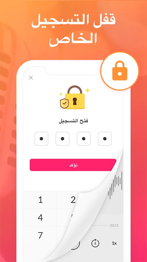 من المزايا التي حرص المطور على توفيرها بعد تنزيل مسجل الصوت السهل مهكر برابط مباشر هي الحفاظ على خصوصية المستخدمين وذلك من خلال توفير خدمة التأمين, أي يمكنك تحديد أي تسجيل والقيام بتأمينه بكلمة مرور, لكي لا تتمكن من تشغيله من المكتبة سوى بعد القيام أولا بإدخال كلمة السر التي تقوم بتعيينها, يعمل تطبيق تسجيل الصوت Voice Recorder مهكر اخر اصدار أيضا على توفير ميزة التأمين الاحتياطي الذي يمكن اللجوء إليه في حالة نسيان كلمة المرور التي قمت بتعيينها.
