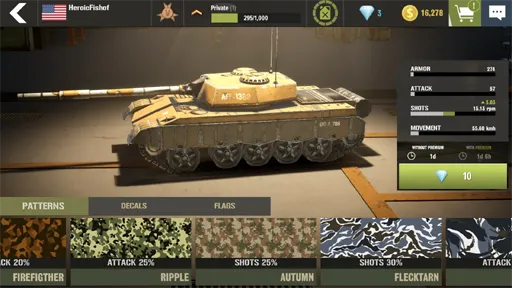 مع التقدم في لعبة War Machines Tanks Battle مهكرة تلاحظ زيادة صعوبة التحديات التي تواجهها لذلك حرص المطور على توفير خدمة الترقية التي يمكنك بواسطتها ترقية القدرات والإمكانيات المتوفرة في الدبابة وبالتالي تكون أكثر تدميرا وتستطيع القضاء على الدبابات الأخرى بسهولة أكبر, يمكنك الإستمتاع أيضا بميزة التخصيص التي توفر الإمكانية في ضبط مظهر العرض الخاص بالدبابة من خلال تحديد الألوان الخاصة بها بالإضافة لتحديد الملصقات التي تظهر على الجسم الخارجي كما يمكنك اختيار العلم المراد من بين أعلام عديدة.